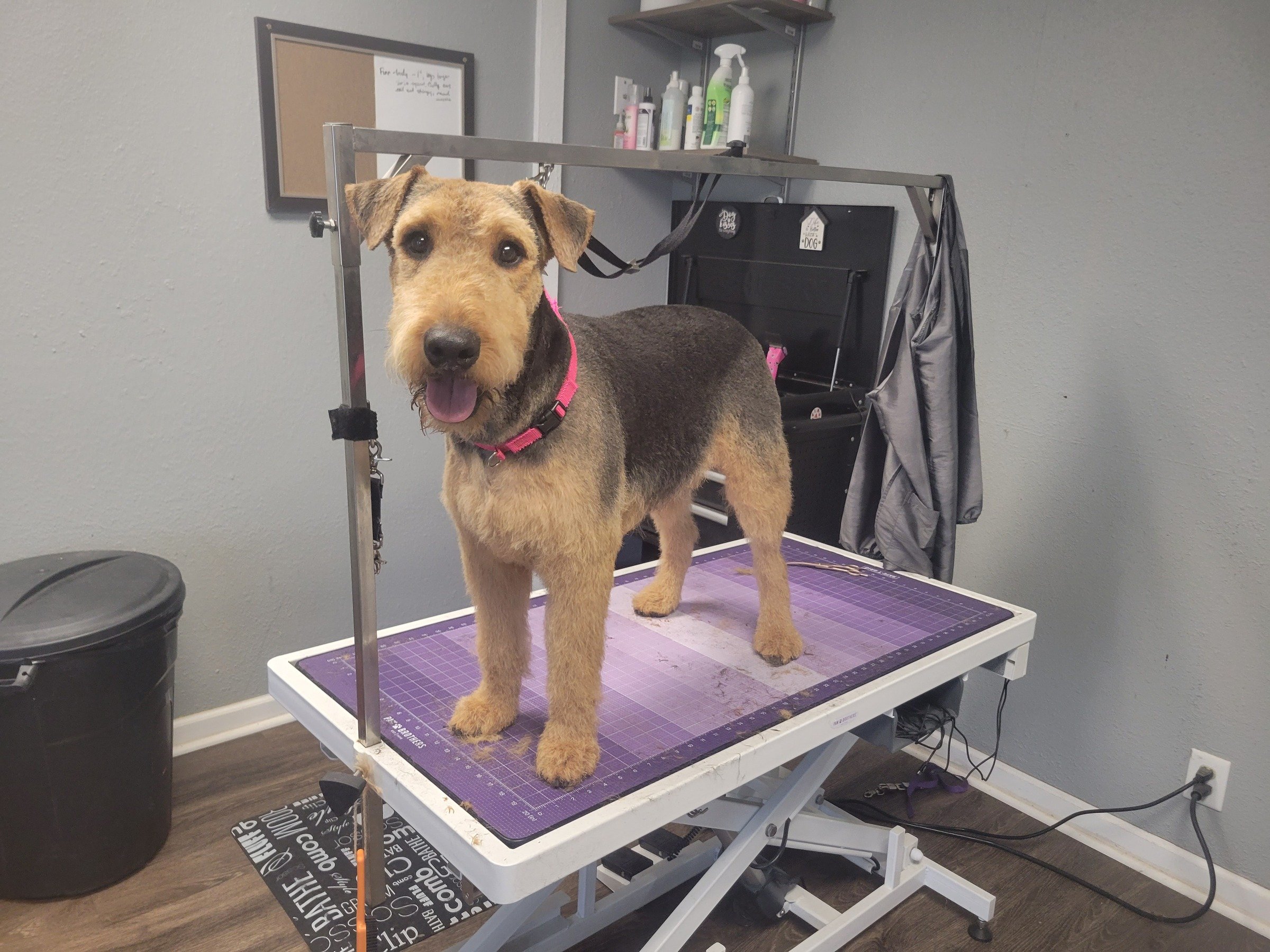 Full groom, de-shedding treatment, teeth brushing, ear cleaning, cologne, and a bandana. The complete experience.